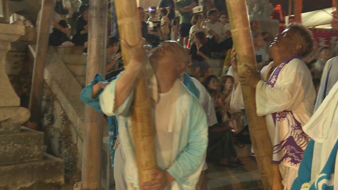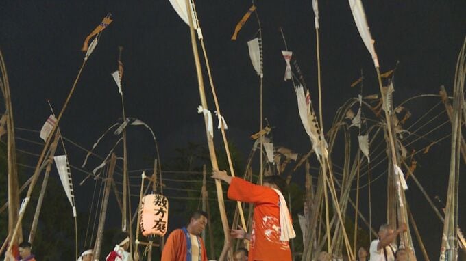 のぼりのついた大竹を担いで境内を練り歩く、天下の奇祭「数方庭祭」が7日、山口県下関市で始まりました。