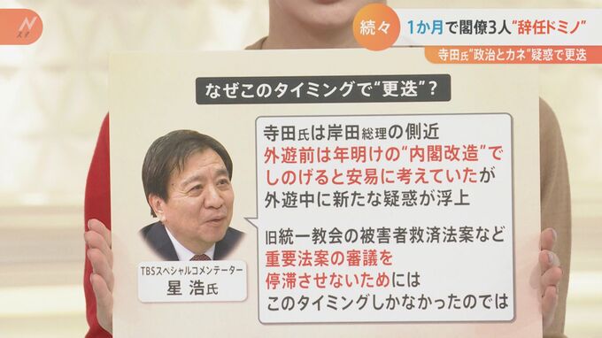 閣僚の辞任は、寺田さんで3人目となりました。1人目は、山際前経済再生担当大臣。旧統一教会との関係が次々と明らかになったことから10月24日に辞任。そして法務大臣のポストを“死刑のはんこを押す地味な役職”と発言し、葉梨前法務大臣が11月11日に辞任。そして寺田前総務大臣が“政治とカネ”問題が次々と明らかになり、20日に辞任と3人目になるわけです。