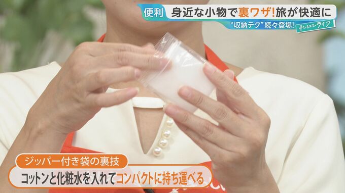 また、100均などでも手に入る『ジッパー付き袋』に、コットンに含ませた化粧水を入れるとコンパクトに持ち運ぶことができます。
