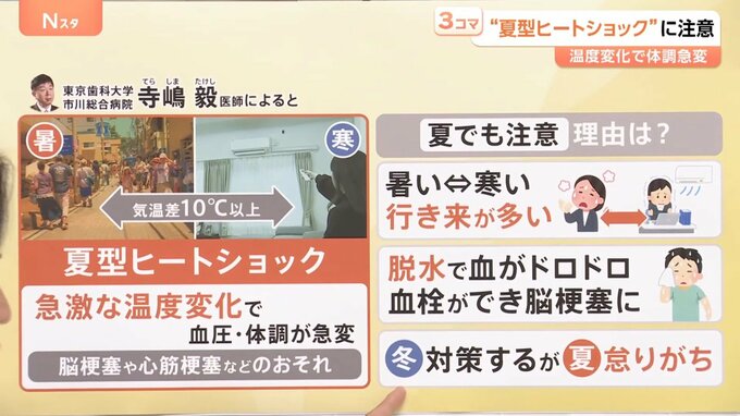 東京歯科大学市川総合病院の寺嶋毅医師によると、例えば夏は35度以上になる屋外と25度以下の屋内だと、10度以上の差があるので“夏型ヒートショック”のリスクが高まってくるということです。