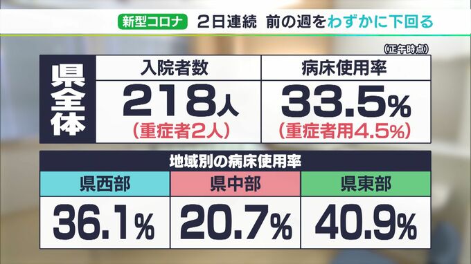 病床使用率は静岡県全体で33.5%で、最も高い県東部では40.9%となっています。