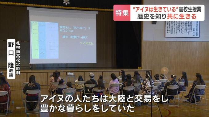 体育館に集まった定時制の生徒約80人。菜々さんの特別授業の前に、野口先生からアイヌ民族の歴史や差別を受けてきた過去を学びました。