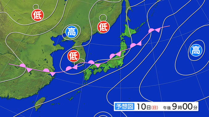 【大雨情報】“秋雨前線”の北上で3連休は九州から東北で大雨に 24時間予想雨量は九州北部や四国で300ミリのところも 雨と風シミュレーション 北陸放送 2025年8月9日(土) 17:27 国内 10日(日)以降、秋雨前線が北上する影響で、日本列島は広い範囲で大気の状態が非常に不安定になり雨が強まるでしょう。この1週間程度で降った雨の量が平年よりかなり多いところでは、とくに土砂災害への注意・警戒が必要です。 10日午前9時の予想天気図です。9日(土)は九州を通り本州の南岸にかけてのびていた秋雨前線が北上し、北陸から関東にかかかる見込みです。 10日(日)午前9時の予想天気図 前線はその後も停滞し、11日(月)は山陰から東北の日本海側へと前線がのびる状態になりそうです。 11日(月)午前9時の予想天気図 また、3連休は低気圧も黄海から日本海を進む見込みで、週明けにかけては九州から東北の広い範囲で暖かく湿った空気が流れ込み、大気の状態が非常に不安定になるでしょう。