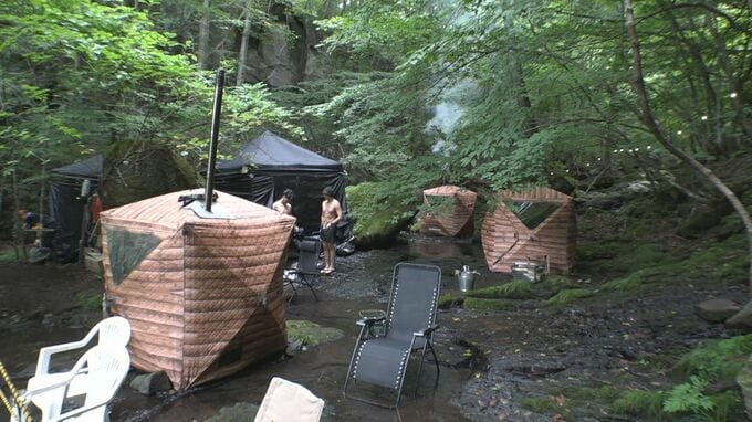 標高およそ1300メートル佐久穂町・八千穂高原で開催中のヴィヒタサウナフェス。森の中を流れる川べりには6張りのテントが設けられ、サウナを楽しむことができます。川の水を熱せられた石にかけると…「ジュー」(…
