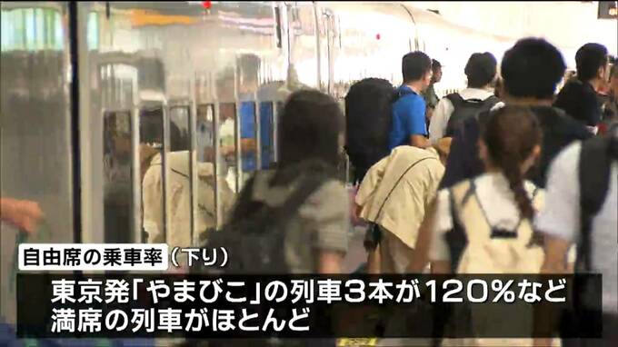 JR東日本によりますと東北新幹線の「下り」は、9日が混雑のピークで自由席の乗車率は東京発の「やまびこ」の列車3本が120%となるなど満席の列車がほとんどです。指定席も午後8時頃まで、ほぼ満席です。