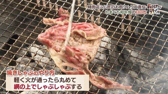 ●肉を広げて置き、軽く火が通ったら丸めて網の上でしゃぶしゃぶする