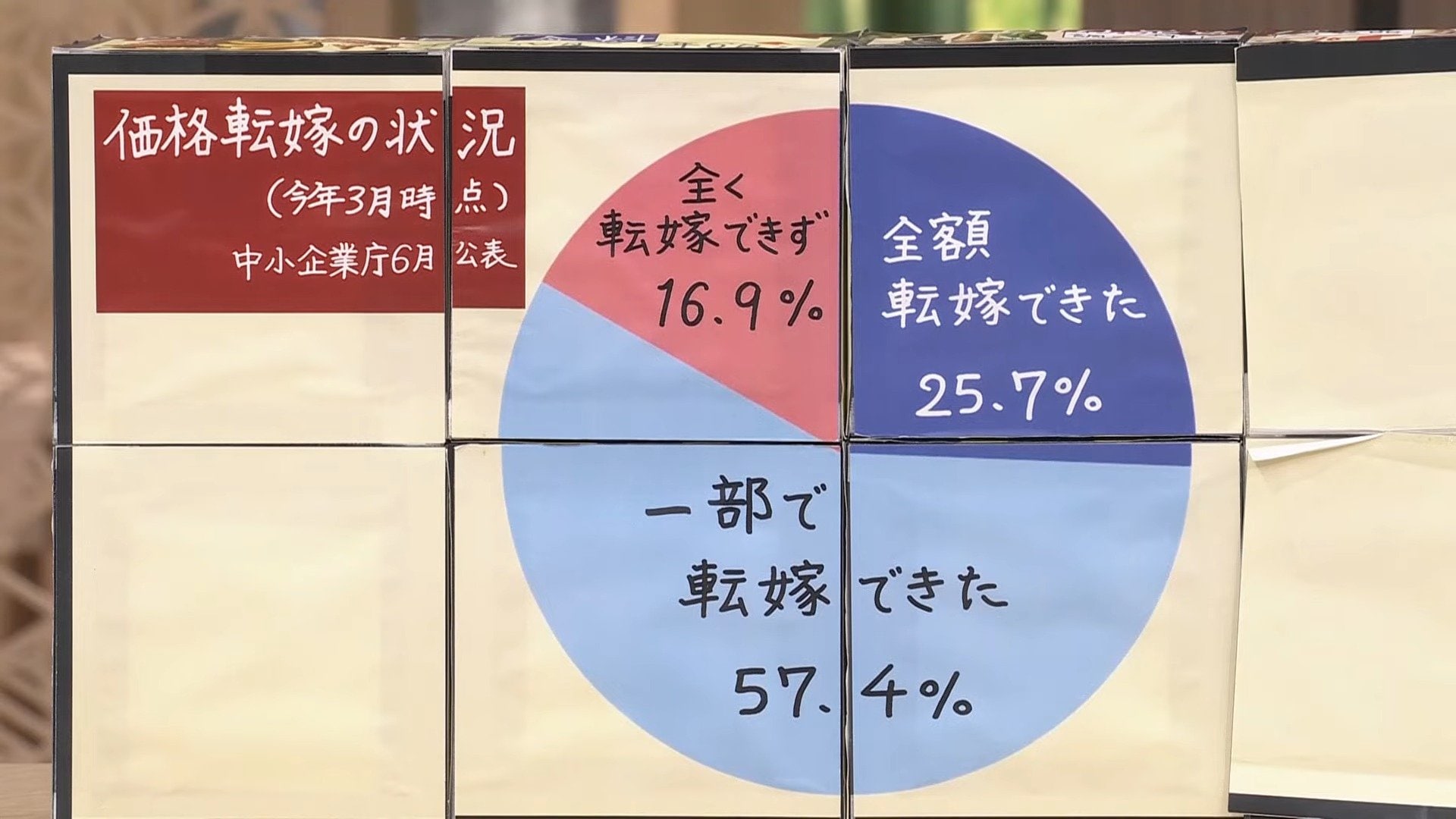 中小企業庁の調査によると、原材料やエネルギー、人件費などが高騰した分の生産コストを売っているモノの値段に「全額転嫁できた」企業は、全体の4分の1ほどにとどまっており、「全く転嫁できていない」という企業は16.9%もあります。