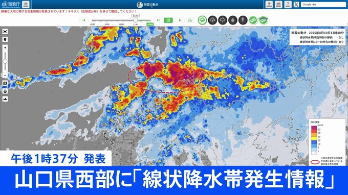 気象庁は午後1時37分、山口県の西部に「線状降水帯発生情報」を発表しました。この情報が発表された地域では、線状降水帯によって同じ場所で非常に激しい雨が降り続いていて、命に危険が及ぶ土砂災害や浸水、河川…