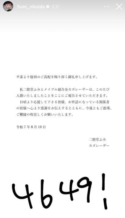 連名の発表文の画像と共に「4649!」と、手書きのメッセージを添えています。