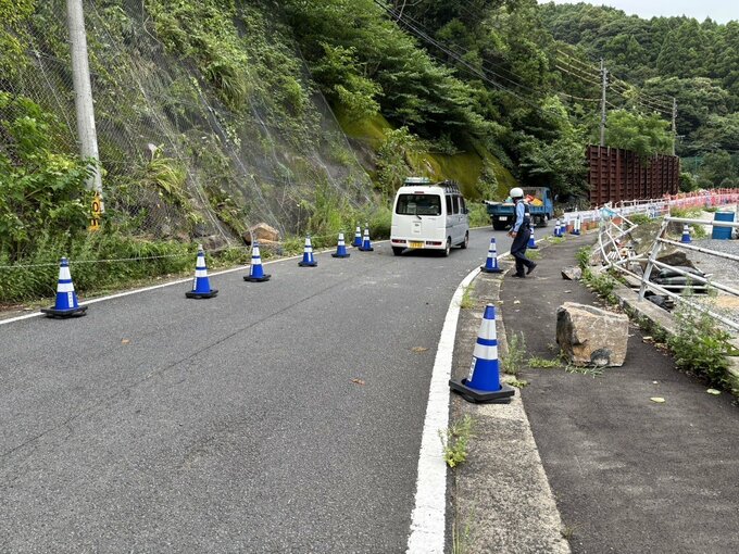 駆けつけた市の職員が崖の上に落石の危険がある岩の塊を確認したことから、県は10日午後3時から現場の道路約1.7キロを全面通行止めにしました。
