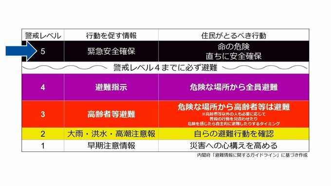 「緊急安全確保(警戒レベル5)」は、5段階の警戒レベルのうち、危険度が最も高い「警戒レベル5」です。「緊急安全確保(警戒レベル5)」が発表された地域では、すでに水害や土砂災害が発生しているか、災害の発生が差し迫っている状況です。