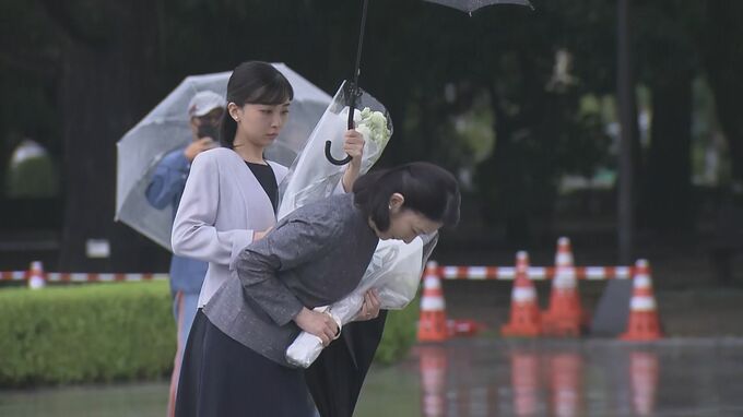 広島県を訪問中の秋篠宮妃紀子さまと次女の佳子さまが平和公園を訪れ、「原爆慰霊碑」に供花されました。紀子さまと佳子さまは、きょう午前8時すぎ、グレーの装いで広島市にある平和公園に到着されました。雨の中…