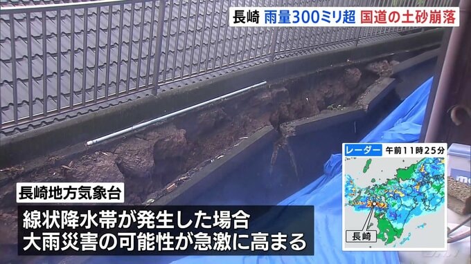 長崎県内でも記録的な大雨となっていて、土砂災害などの被害が相次いでいます。大気の状態が非常に不安定となっている長崎県内では、昨夜から各地で雷を伴った大雨となっています。線状降水帯が発生した長崎市など…