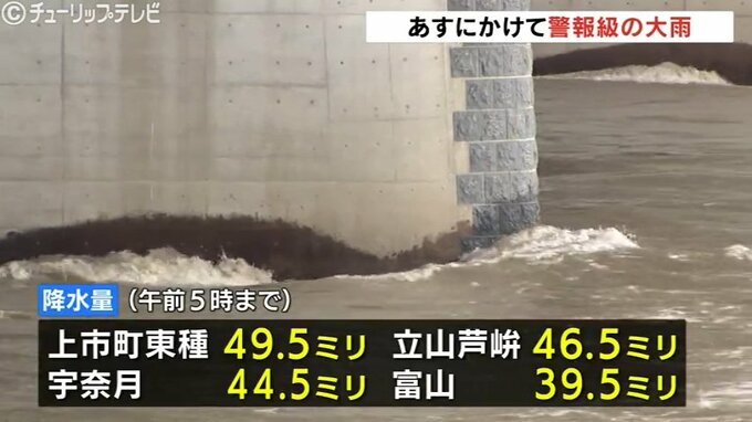 富山地方気象台によりますと、降り始めから11日午前5時までの降水量は、上市町東種で49.5ミリ立山芦峅で46.5ミリなどとなっています。
