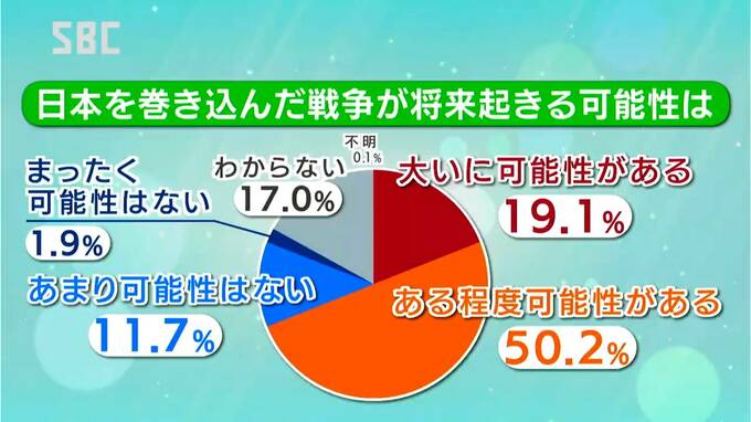 また、「日本を巻き込んだ戦争が起こる可能性があると思いますか」の問いに対し、「ある程度可能性がある」が50.2%と半数を超え、「大いに可能性がある」と合わせると7割近くに達しました。