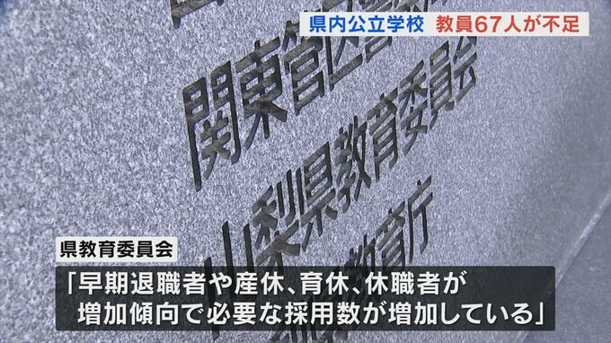 山梨県内の公立の小・中・高校と特別支援学校で不足している教員数は67人に上ります。