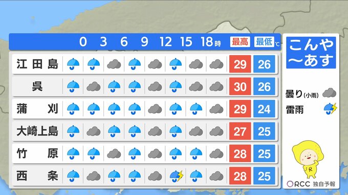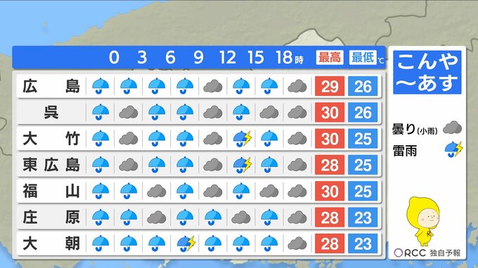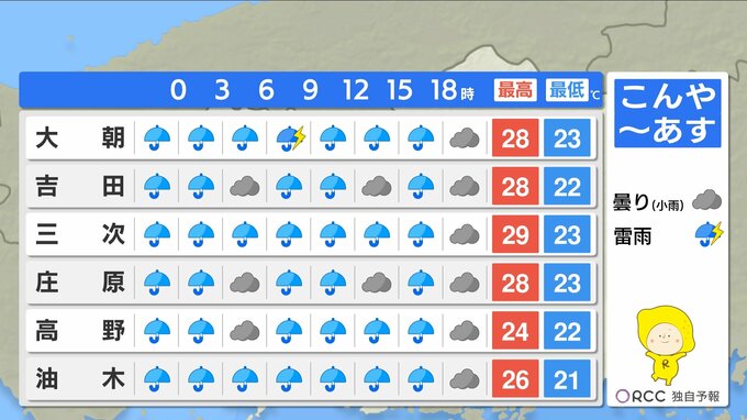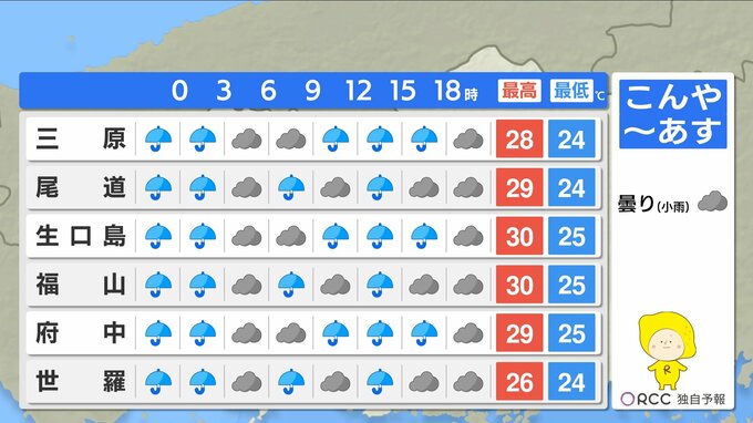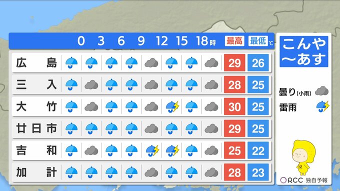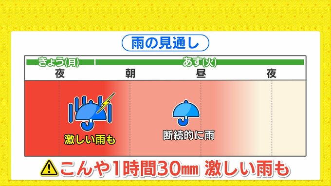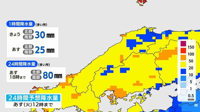山陰沖に停滞する前線に向かってあすも暖かく湿った空気が流れ込みやすくなります。あすも断続的に雨が降る見込みで、雨脚が強まる時間帯があるでしょう。ただ、きょうよりも止み間がある予想です。きょうこの後の1時間雨量は、多いところで30ミリの激しい雨が降る地点がある見込みです。