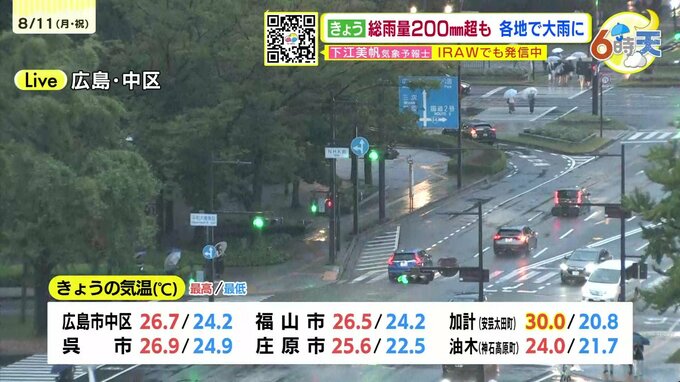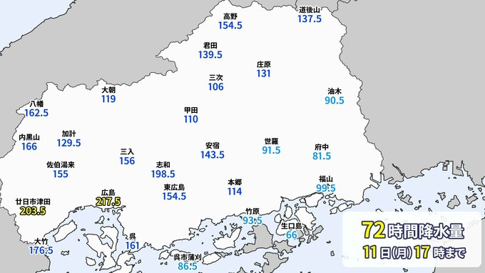 きょう(11日(月・祝))の広島県内は、山陰沖に停滞する前線や低気圧の影響で断続的に雨が降り、雨脚が強まった時間もありました。きょう17時までの降り始めからの雨量は、広島市中区で217.5ミリ 廿日市津田で203.5ミリ を記録しました。南西部を中心に総雨量が多くなり大雨となっています。これまでの大雨で地盤が緩んでいる所があります。雨が降っていなくても、引き続き土砂災害に警戒をしてください。