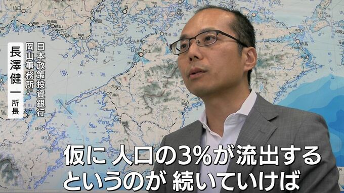 日本政策投資銀行岡山事務所が総務省の「人口移動報告」の日本人の移動を分析したものです。注目しているのは、県外に転出した人が転入した人を上回る割合を示す「転出超過率」、20歳から24歳の女性で見ると2010年には0.86%でしたが、2024年には2.91%まで上昇しています。また、同年代の男性も2倍以上に。若い世代の女性の流出は少子化をさらに進めることになると分析した長澤所長は警鐘を鳴らします。