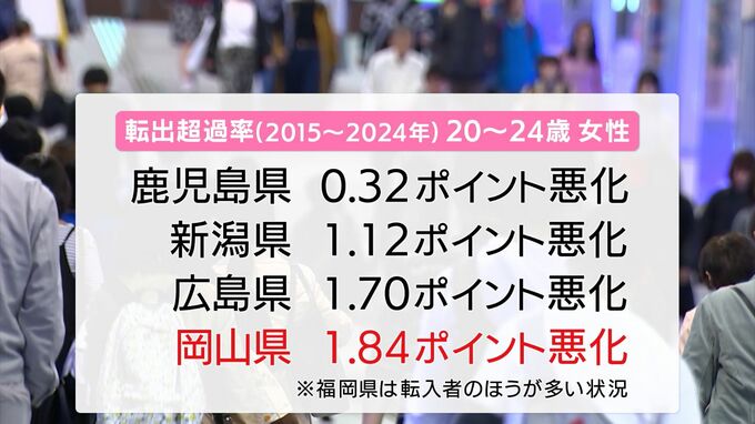 リポートでは、隣りの広島や岡山と人口規模などが比較的近い新潟、鹿児島、さらに若者の女性比率が高いとされる福岡と比較。去年までの10年で見ると20代前半の女性の転出は岡山が1.84ポイント悪化で、唯一、転入している福岡も含めて最も増えています。