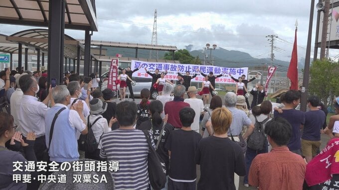 交通安全を呼びかける街頭指導が高速道路のサービスエリアで行われ、学生たちが”応援”で事故の防止を訴えました。