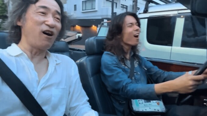 投稿された画像では、東儀秀樹さんが助手席、息子の東儀典親さんが運転席に座り、人気ロックバンド「T・レックス」の名曲「20th Century Boy」を熱唱する姿が見て取れます。