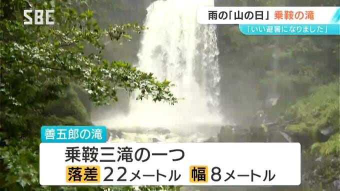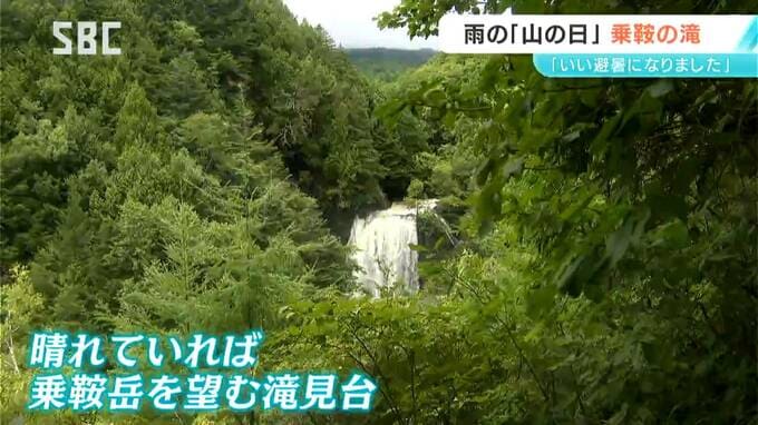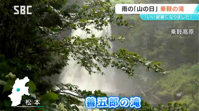 松本市の乗鞍高原は雨が降ったり止んだりでしたが、横から雨を浴びるように豪快に水しぶきを上げる「善五郎(ぜんごろう)の滝」には観光客が次々にやってきました。