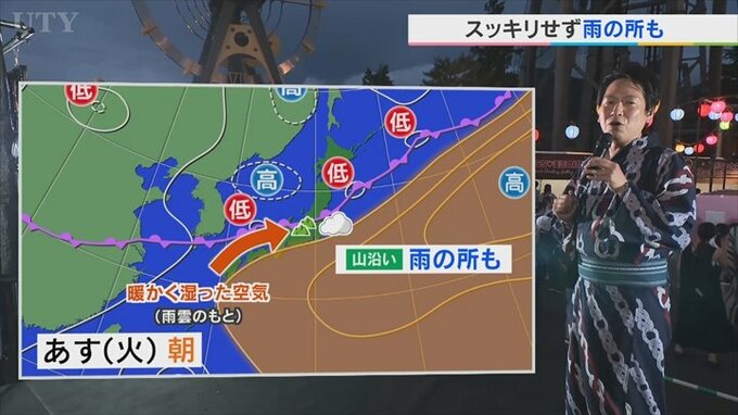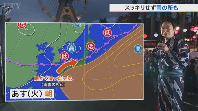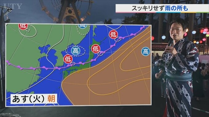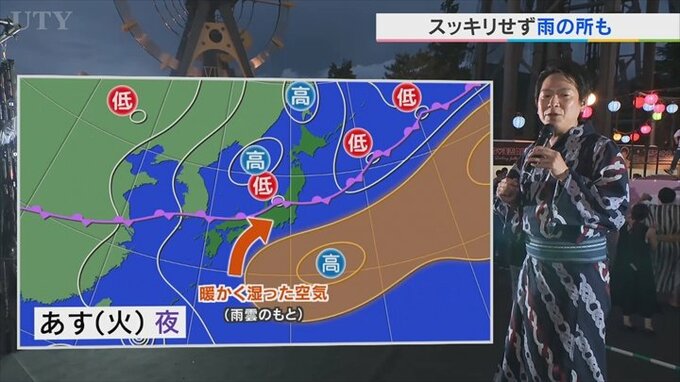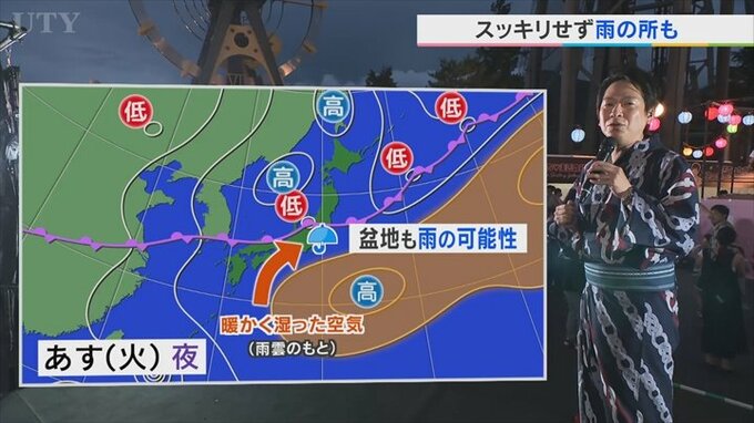 これだと、南から雨雲が入ってきやすい状況になりますので、これによってあすの夜は盆地で雨のところが出てくると予想しています。