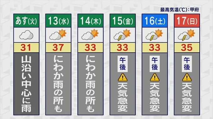 まず、あすから木曜日にかけては雲が広がりやすく、水曜日、木曜日は盆地でもにわか雨の可能性があると予想しています。