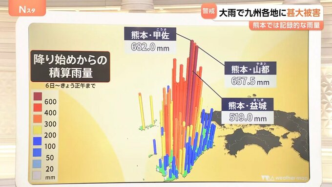 6日から11日正午までの降り始めからの積算雨量ですが、▼熊本・甲佐で682ミリ、▼熊本・山都で657.5ミリ、▼熊本・益城で519ミリとなっていて、非常に多くなっているのがわかります。