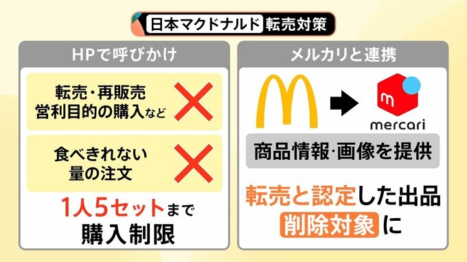 また、メルカリと連携をしました。▼商品情報・画像をメルカリ側に提供し、転売と認定した出品に関しては削除の対象にするという対策を、マクドナルド側は取っていたようです。