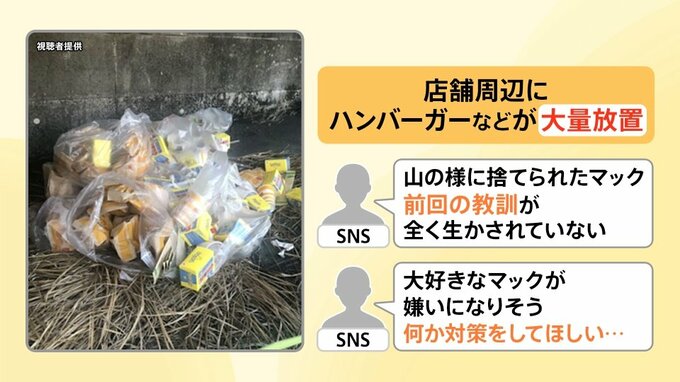 これに対して、SNS上では「山のように捨てられたマック 前回の教訓が全く生かされていない」「大好きなマックが嫌いになりそう。何か対策をしてほしい…」との投稿があります。