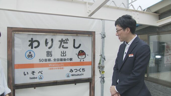 企画開発部・菊地聡 課長「割出駅は、日本全国の鉄道駅を50音順で並べた際の最後の駅です。そのことを広く周知し、地域の皆様や来訪者に親しんでいただくため、浅野川線開業100周年記念事業の一環として駅名標を更新したほか、新たに駅入り口と線路側壁面に駅名パネルを設置しました」