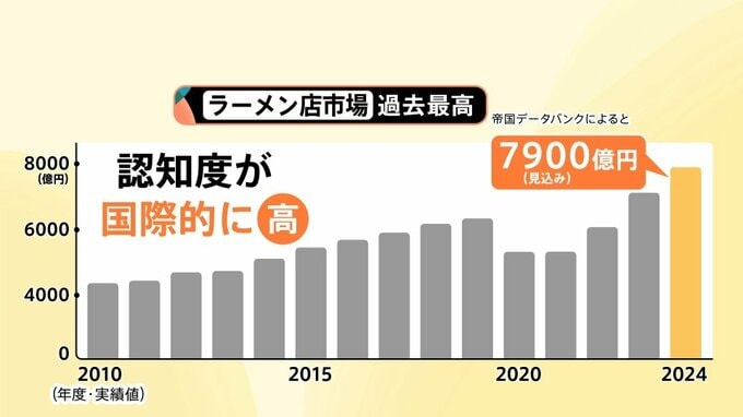 帝国データバンクによると、過去のデータではラーメン店の市場はコロナ禍でいったん下がりますが、2024年度は7900億円(見込み)と過去最高になっています。日本のラーメンの認知度が国際的に高まり、インバウンドでの集客が好調だったことなどが要因だそうです。