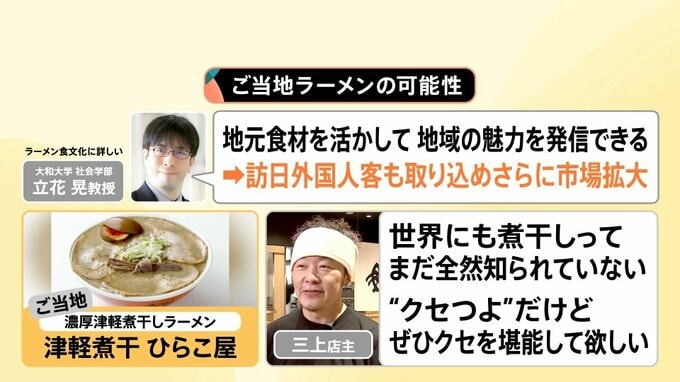 ご当地ラーメンに関して、ラーメンの食文化に詳しい大和大学社会学部・立花晃教授にお話を伺ったところ、「地元食材を活かして、地域の魅力を発信できる。訪日外国人客も取り込めて、さらに市場拡大するのではないか」とのことです。