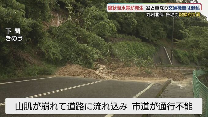 下関市では山肌が崩れて道路に流れ込み、市道が通行できない状況に。近くの人たちが自主的に交通整理をする姿が見られました。