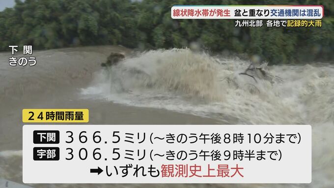 24時間の雨量は下関で366.5ミリ(~10日午後8時10分)、宇部で306.5ミリ(~10日9時30分)と、いずれも観測史上最大となりました。