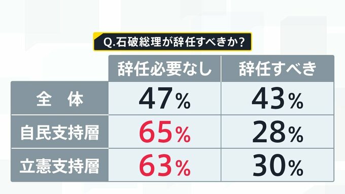 今回の参院選の敗北を受け石破総理が辞任すべきかどうかを聞いたところ「辞任すべき」が43%で「辞任する必要はない」は47%。「辞任の必要がない」ほうがやや上回った。さらに自民党支持層と立憲民主党支持層で分析すると、自民支持層で「辞任の必要なし」は65%、立憲支持層でも「辞任の必要はなし」が63%で両者の差がほとんどなかった。