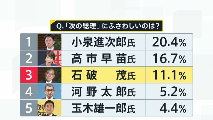 「次の総理にふさわしい人」という設問についても、石破総理は「3位」にランクインしている。そもそもこの設問は各社、時の総理の“終わりが見え始めた”頃に設問して取り上げられる傾向にあり、例えば岸田総理が辞める直前の24年8月のJNN世論調査で同じ質問をしたところ、岸田総理は「6位」だった。