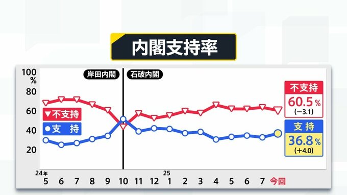 最新のJNN世論調査で石破内閣の支持率が前月と比べて4.0ポイント上昇し、36.8%となった。参院選に敗北したこのタイミングでなぜ内閣支持率が改善したのか。