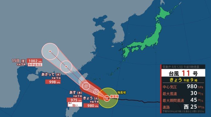 気象庁によりますと、台風11号は、12日午前9時には沖縄の南にあって、1時間におよそ25キロの速さで西へ進んでいます。中心の気圧は980ヘクトパスカル、中心付近の最大風速は30メートル、最大瞬間風速は45メートルです。中心から半径75キロ以内では風速25メートル以上の暴風となっています。また、中心の北東側280キロ以内と南西側220キロ以内では風速15メートル以上の強い風が吹いています。