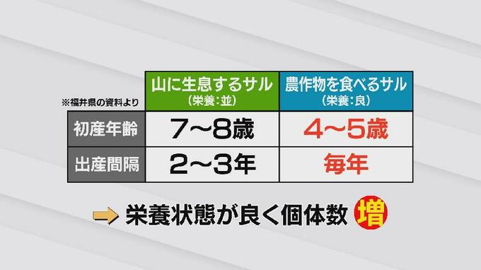 山に生息するサルと農作物を食べるサルを比較すると、農作物を食べるサルは初産年齢が2、3年ほど早く、さらに出産間隔も短いの特徴です。