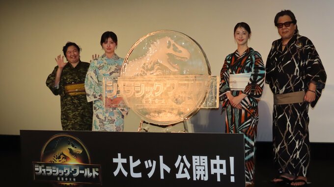 お笑い芸人のやす子さんが映画『ジュラシック・ワールド/復活の大地』の大ヒット記念 新ジュラ夏祭りイベントに、俳優の松本若菜さん、吉川愛さん、声優の楠大典さんとともに登壇。