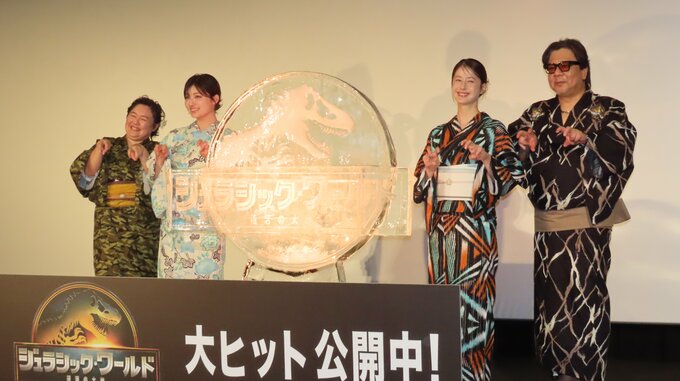 俳優の松本若菜さん、吉川愛さん、声優の楠大典さん、お笑い芸人のやす子さんが、映画『ジュラシック・ワールド/復活の大地』の大ヒット記念 新ジュラ夏祭りイベントに登場しました。