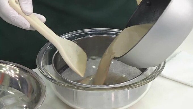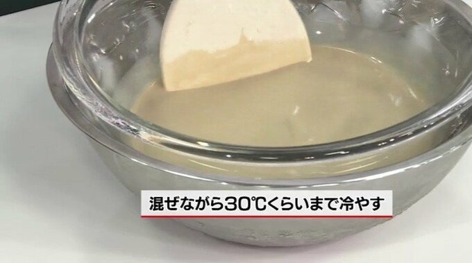3.2に生クリームを加えザルでこし、冷水にあてて30度くらいまで冷やす。