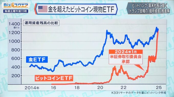 「2024年1月に、ビットコイン現物ETFができて凄まじい人気になっている。機関投資家などが『待ってました』とドッと入ってきた感じで、1年でゴールドのETFの残高を超えるぐらいに成長している」