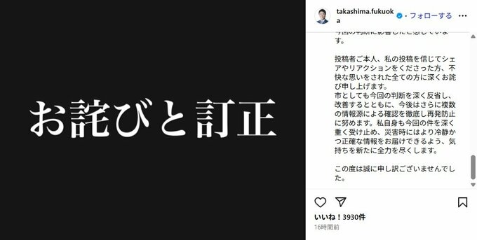 高島市長は自身のSNS「インスタグラム」と「フェイスブック」「アメーバブログ」で、「災害時には正確な情報発信が何よりも大切です」「本当に情けなく、恥ずかしい限りです」と謝罪しました。