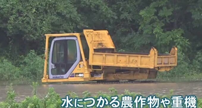 12日午前の輪島市町野町。畑の農作物や重機が、茶色い水に浸かっています。