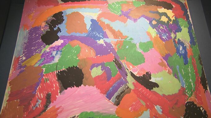 こちらの、独創的な色彩感覚と大胆なタッチで描かれた抽象画のような作品は、富山県南砺市の福祉事業所に通う男性が描いたものです。男性の才能が開花してわずか3年、今や事業所を代表するアーティストとして活躍してます。