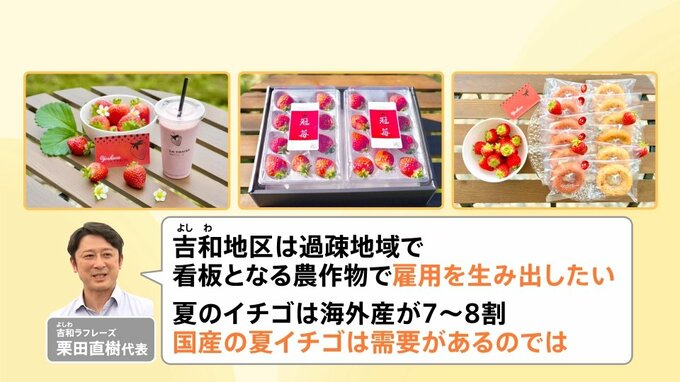 栗田代表は、「吉和地区が過疎地域で、看板となる農作物で雇用を生み出したい。夏イチゴは海外産が7~8割を占めていることから、国産の夏イチゴは需要があるのでは」と考えて勝負に打って出たということです。